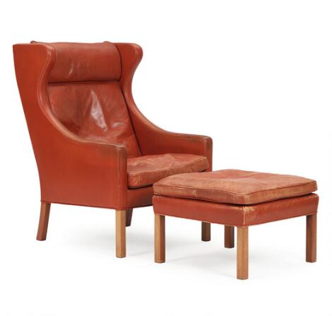 2545/983Børge Mogensen: Wingback chair and stool with mahogany legs, upholstered with red brownish leather. (2)
