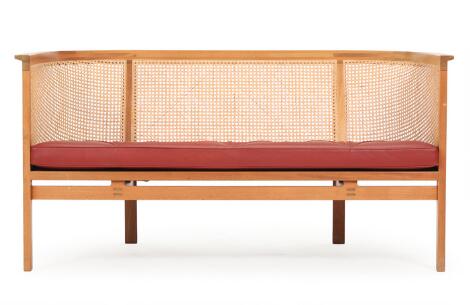 2545/955Rud Thygesen, Johnny Sørensen: "Kongeserien" Two seater sofa of mahogany, sides and back with woven cane. Seat upholstered with red leather.