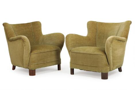 2545/820Danish furniture design: A pair of easy chairs with dark stained beech legs, upholstered with green velour. 1930-40s. (2)