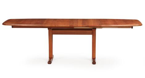 2545/895Danish furniture design: A solid teak dining table with extension and three extra leaves. J.L. Møllers Møbelfabrik. 1980s. H. 73. L. 145/246. W. 95 cm. (4)