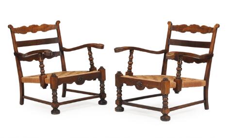 2545/900Danish furniture design: A pair of patinated oak easy chairs, seats with papercord. 1930s. (2)