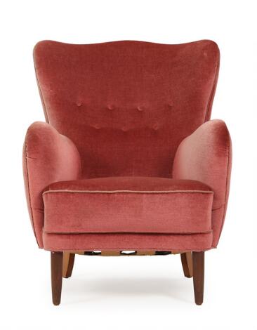 2545/961Danish furniture design: Easy chair with dark stained beech legs, upholstered with rose coloured velour. 1930-40s.
