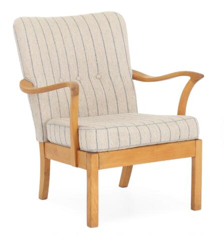 2545/946Fritz Hansen: Beech easy chair. Cushions in seat and back upholstered with light, striped wool.