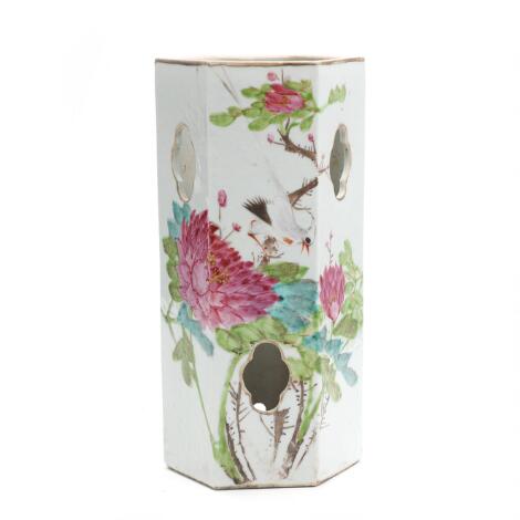 2548/27LyngbyA Chinese enamelled porcelain hatstand of hexagonal form, Qing dynasty late 19th century. Mounted as a lamp. H. excl. the mounts 27.5 cm.