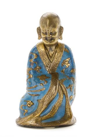 2548/129LyngbyA Chinese blue enamelled bronze figure of a seated Lohan. Qing dynasty, late 19th century. Weight 814 g. H. 16.5 cm.