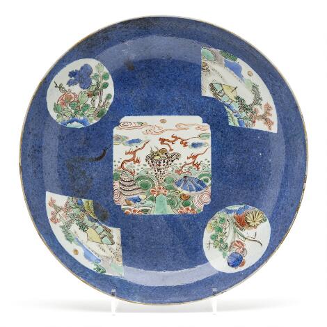 2548/135LyngbyA Chinese famille verte dish, powderblue ground, base with double circles in underglaze blue, Kangxi 1662-1722. Diam. 28 cm.