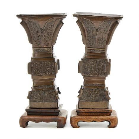 2548/117LyngbyA pair of Chinese "gu" vases of patinated bronze, archaic form. Late Ming (1368-1644). Weight 837 g. H. 16 cm. (2)