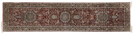 2548/341GlostrupAn Oriental runner in Isfahan quality. Design with three medallions. Fine qulity, ca. 800.000 kn. pr. sqm. Areas with silk pile. 370 x 85 cm.