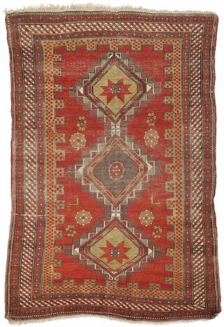 2548/296GlostrupA Kasak rug, Caucasus. Design with three linked step shaped rhomb medallions. Early 20th century. 235 x 168 cm.