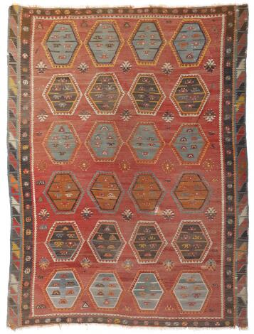 2548/310GlostrupA large decorative Turkish kilim in soft colors. All over desugn of hexagones on a red field. Early 20th century. 255 x 340 cm.