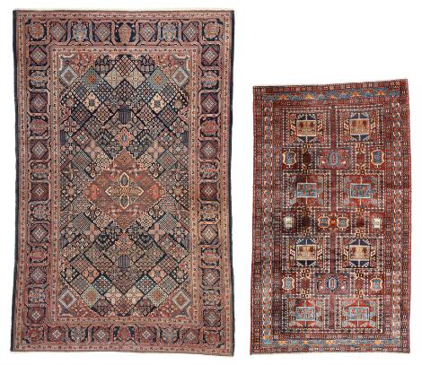 2548/332GlostrupTwo Persian rugs. A sigend North West Persian figural rug. Signed: Shahanshah Iran. 117 x 90 cm. And Mashlaghan. 125 x 79 cm. Both mid-20th century.(2)