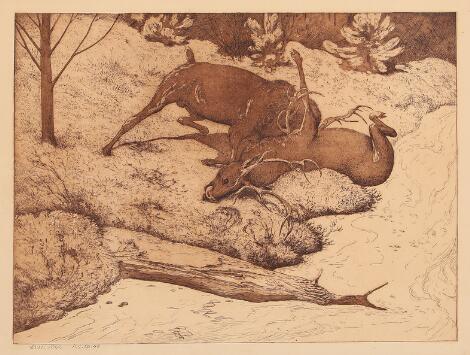 2548/267AarhusLouis Moe: Landscape with fighting red deer. Signed in print Louis Moe, Rad. Op. 48. Etching. Visible size 39 x 49 cm.