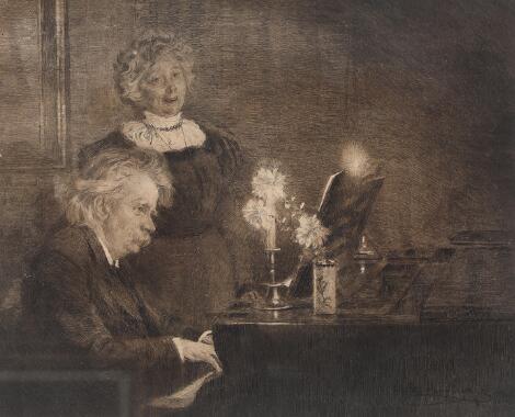 2548/266AarhusP. S. Krøyer: “Edvard Grieg akkompagnerer fru Nina Griegs sang”. Signed in the print. Etching. Visible size 32 x 39 cm.