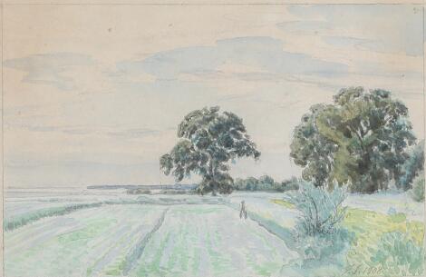 2548/268AarhusJoakim Skovgaard: "Mellem skov og fjord". Signed and dated JS 1908. Watercolour on paper. Sheet size 18 x 25.5 cm.