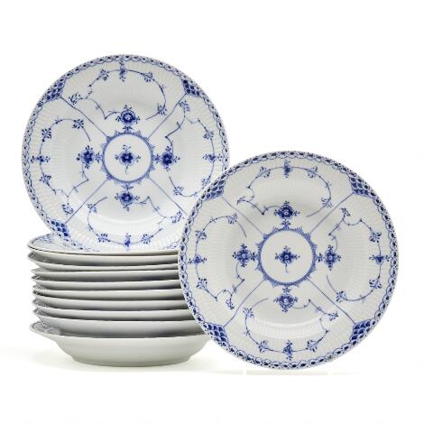 2548/273Lyngby"Blue Fluted Half Lace" 12 deep porcelain dinner plates. 2x570 og 10x565. Royal Copenhagen. Diam. 25 cm. (12)