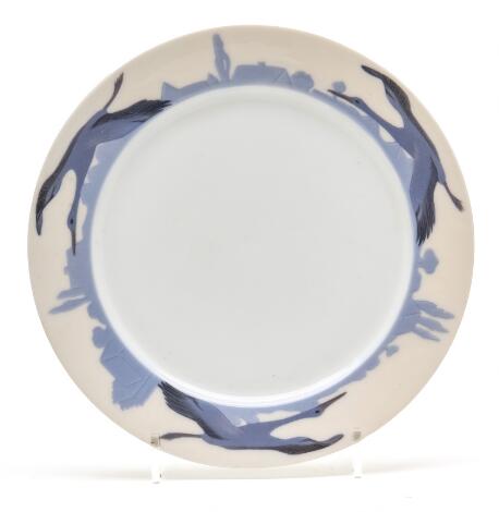 2548/249LyngbyArt Nouveau porcelain plate, decorated in underglaze blue with storks flying over rooftops. Royal Copenhagen, 1894-1900. Diam. 22 cm.
