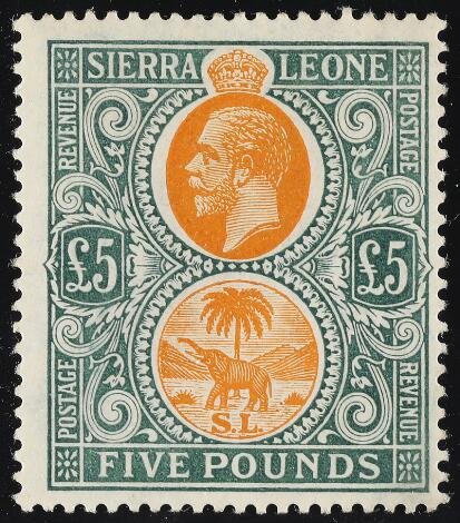2548/4896GlostrupSierra Leone. 1921-21. £5, vm. Mult Crown CA. Særdeles sjældent fejlfrit mærke i POSTFRISK kvalitet! Liebhaver mærke! (SG £3750 som ubrugt!!).