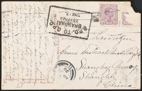 2548/4881GlostrupKina. Postkort med fejl og defekte frimærker men med sjældent kassestempel B.P.O. TO C.P.O SHANGHAI 28 APR 20.