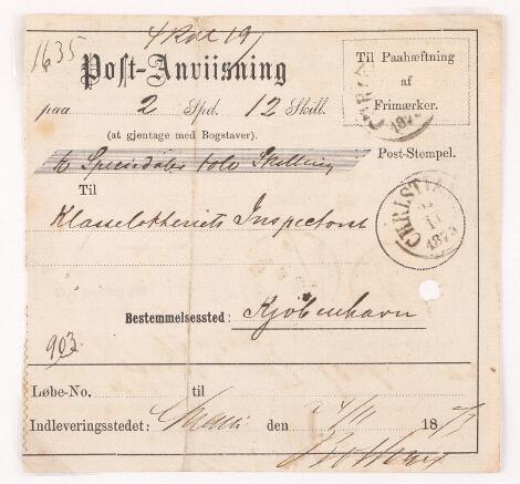2548/4329Glostrup1873. Postanvisning fra Norge på 2 Spd. og 12 sk. stemplet Christiania 24.11.1873 til København.