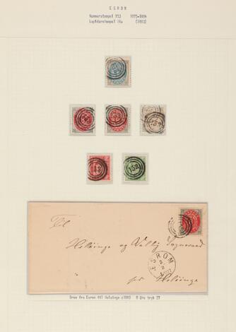 2548/4350GlostrupEsrom. Side fra udstillingssamling med løse mærker og brev med nr.stempel 153
