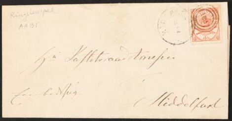 2548/4345GlostrupBAHNHOF-LUBECK 20/6 II. Z(UG). Særdeles sjældent Ant.-stempel på brev til Kiel frankeret med 4 sk. 1858 udgave. På bagside Transit stempel Hamburg og ankomstste