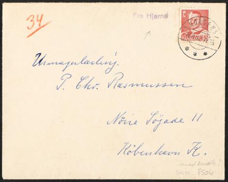 2548/4353GlostrupFra Hjarnø. Godt violet liniestempel "Fra Hjarnø" på skibsbrev frankeret med 30 øre stemplet HORSENS 18.8.52 sendt til KBH. Seneste kendte ifg. Skilling.
