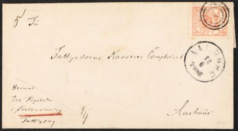 2548/4336GlostrupFattigsag. Sjælden Fattigsag sendt som postanvisning frankeret med 4 sk. afstemplet 4 "AALBORG 12.6" til Aarhus med notation i SV-hjørne "Hermed tre rigsdaler i