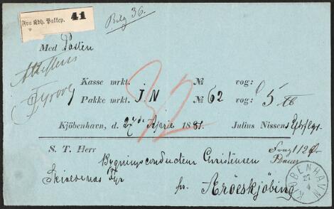 2548/4330Glostrup1881. Ufrankeret adressekort med lapidar KIØBENHAVN 27.4.1881 sendt til Skjoldnæs. Påskrevet "32" øre porto og "Fragt 12 øre".