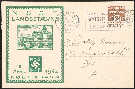 2548/4334Glostrup1942. NSSF Landsstævne 19. April København kort med grønt logo fra National Socialistisk Samler Forbund frankeret med 7 øre. NSSF var et frimærke forbund under