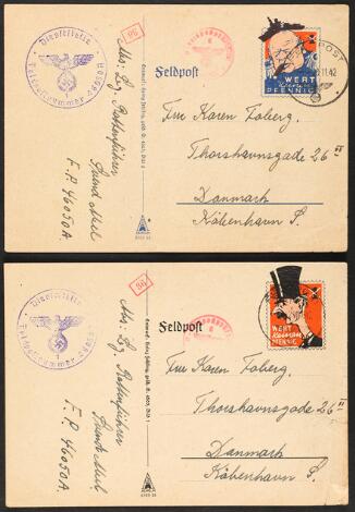 2548/4333Glostrup1942. "Wert Keinen Pfenning". 2 propaganda feltpost kort fra Tyskland under 2. verdenskrig sendt til Danmark. Begge med kraftige folder og små revner.