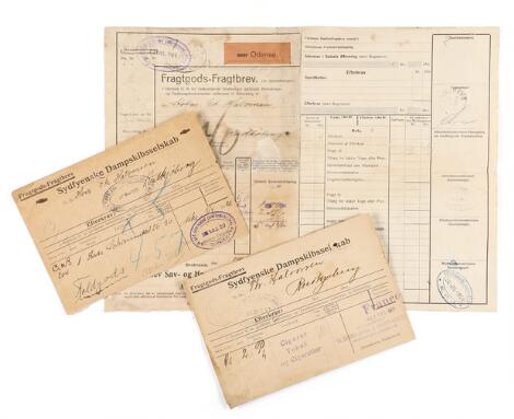 2548/4314GlostrupFragtbreve. 3 gamle fragtbreve fra 1920/1927 alle med ovalt violet stempel "Det sydfynske dampskibsselskab".