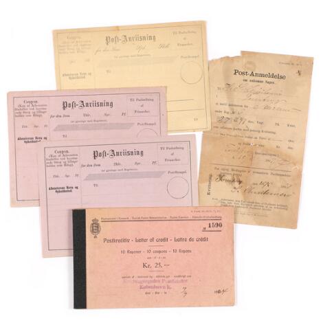 2548/4338GlostrupPostanvisninger. Lille samling med 3 ubrugte med Spd. og Skill. samt Thlr/Sgr./Pf. pg postanmeldelse fra 1907 (noget deffekt) samt Postkreditiv hæfte uden kupon