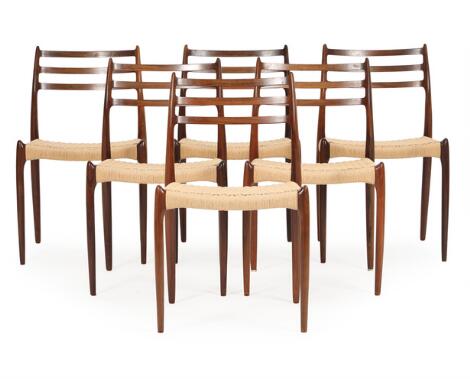 2548/530AarhusNiels O. Møller: Six rosewood chairs, suspended in seats with papercord. Model 78. Manufactured by J. L. Møller. (6)