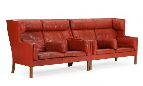 2548/554AarhusBørge Mogensen: "Coupe sofa". Four-seater sofa in two parts with reddish leather and teak legs. L. 154/308 cm. (2)