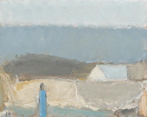 2548/807AarhusJohannes Hofmeister: House by the sea with a figure in the foreground. Signed JH. Oil on compoboard. 40 x 50 cm.
