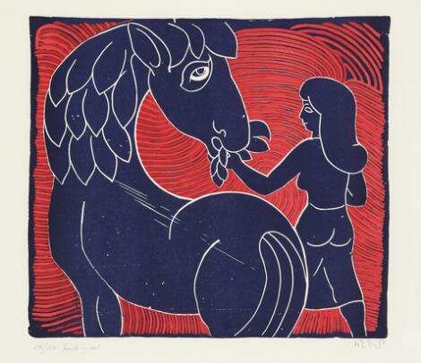 2548/770LyngbyHenry Heerup: "The Woman and the Horse", 1972. Signed Heerup, 140/150. Lithograph in colours. Visible size 47 x 56 cm.
