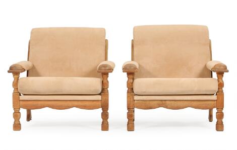 2548/812AarhusDanish furniture design: A pair of solid oak easy chairs, upholstered with light brown alcantara. 1970s. (2)