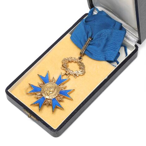 Frankrig, Den Nationale Fortjenstorden, forgyldt metal med blå emalje samt dertilhørende blåt bånd, i original æske