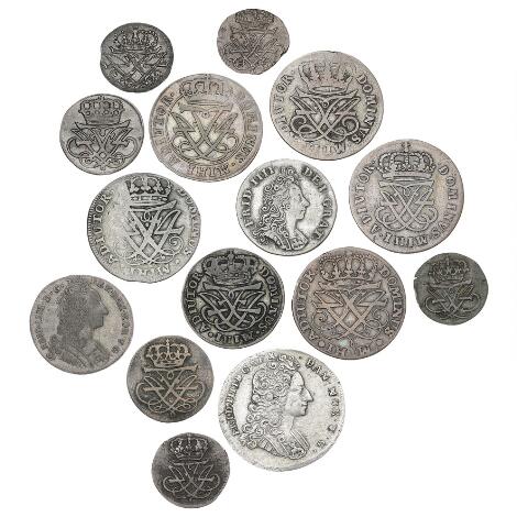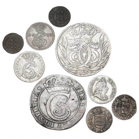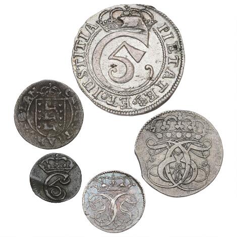 Christian V, samling af mønter, i alt 9 stk. - alle forskellige