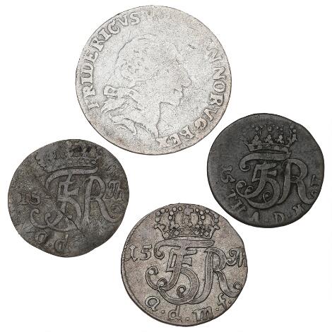 Frederik V, Oldenburg, lille samling af mønter, i alt 4 stk.