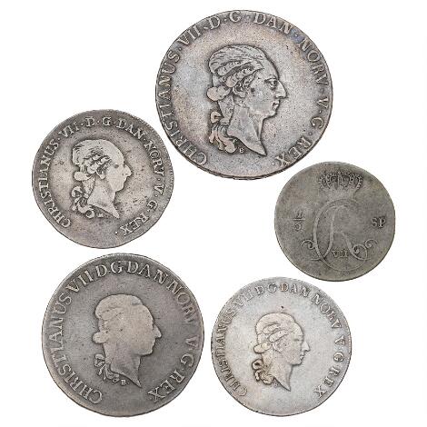Christian VII, Slesvig-Holsten, lille samling mønter, i alt 5 stk.