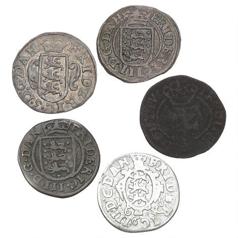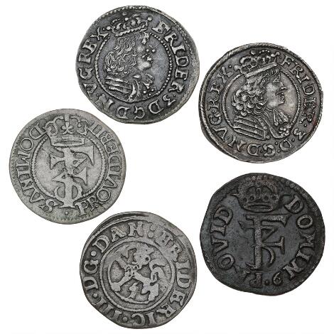 Frederik III, lille samling mønter fra Danmark og Norge, i alt 5 stk.