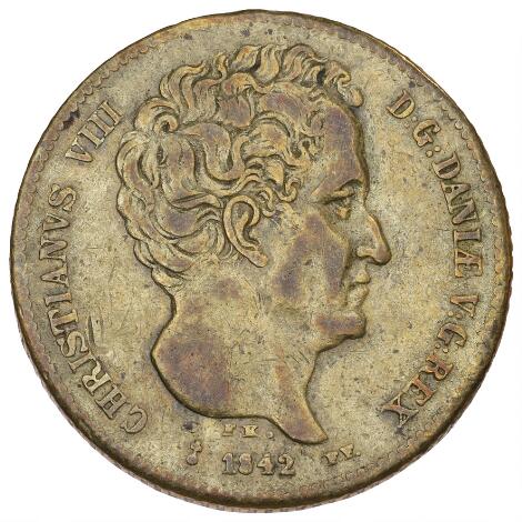 Christian VIII, 32 rigsbankskilling 1842 FF, H 5A, S 3, KM 734, 5,80 g - interessant og sjælden samtidig forfalskning i messing udført af Christian Lüster