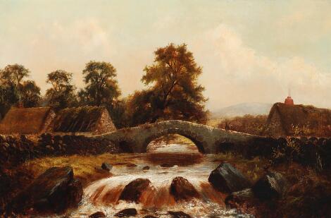 Ubekendt maler, 19. årh.: Parti med et kraftigt åløb under en bro ved nogle huse. Usigneret. Olie på lærred. 62 x 93.