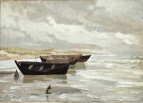 Anton Dorph: Fiskerbåde ved Hornbæk Strand. Sign. A. D. 1880. Olie på lærred monteret på lærred. Ca. 25 x 41 cm.