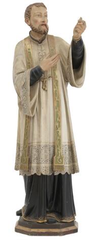 Figur af bemalet, udskåret træ i form af en katolsk gejstlig. 20. årh. H. 122 cm