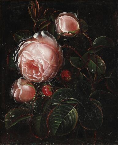I. L. Jensen, skole, 19. årh.: En gren med lyserøde roser og dug på bladene. Sign. B. B. 1842. Olie på malepap. 20,5 x 17 cm.