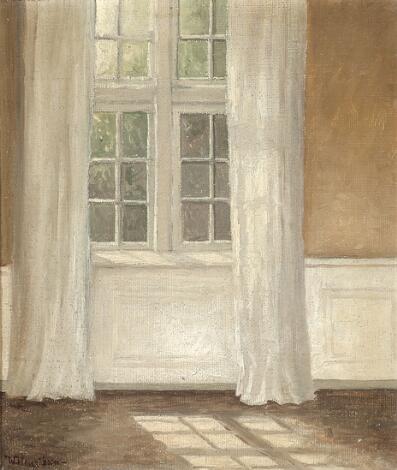 William Henriksen: Et interiør med lysindfald gennem vinduet. Sign. W. Henriksen. Olie på lærred. 24,5 x 21,5 cm.