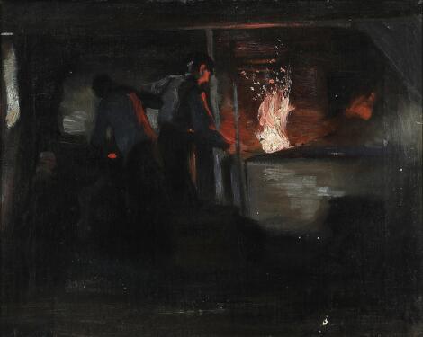 Harald Slott-Møller: Fra en smedie. Sign. H. Slott-Møller. Olie på lærred. 33x 41 cm.