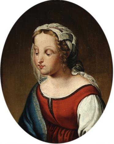 Raphael, efter, 19. årh.: Detalje fra "La Belle Jardinière". Usigneret. Olie på lærred. 35,5 x 28 cm.